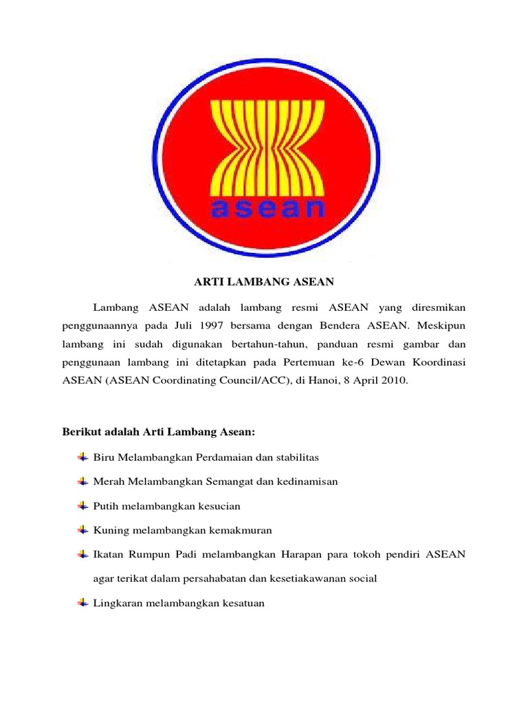 Arti lambang asean semboyan dan anggota asean tentu saja kita semua tahu bahwa indonesia adalah salah satu negara anggota asean. Lambang asean makalah materi tentang organisasi asean beserta pengertian pendiri semboyan prinsip lambang beserta artinya dan tujuannya adalah. Logo ada 4 yaitu biru merah putih dan kuning.
