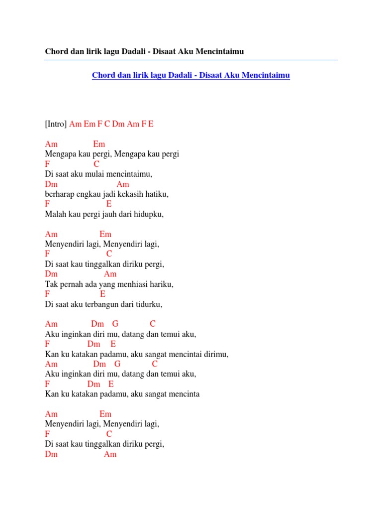 Chord Dan Lirik Lagu Dadali Disaat Aku Mencintaimu