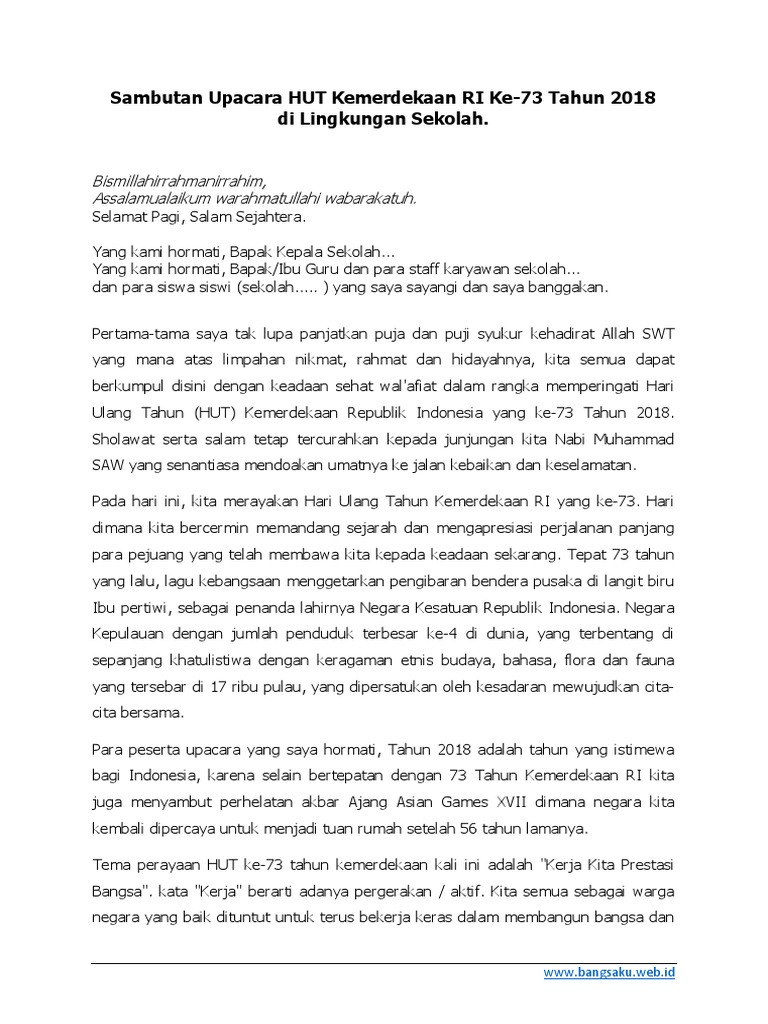 Sambutan Pidato Upacara Hut Kemerdekaan Ri Ke 74 Tahun 2019