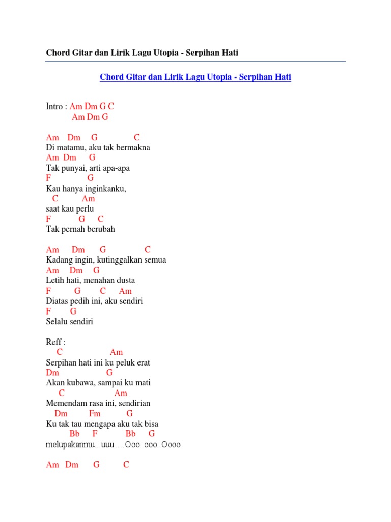 Chord Gitar Dan Lirik Lagu Utopia Serpihan Hati By Chord