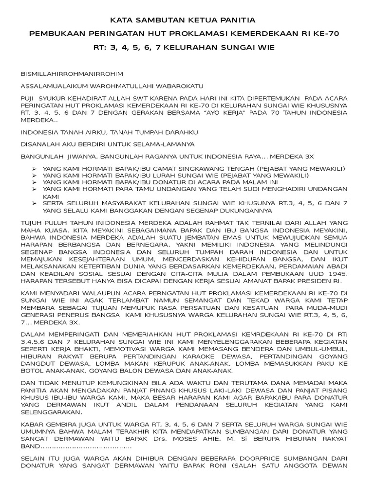 Contoh pidato sambutan ketua panitia 17 agustus hut ri ke 72. Berikut ini adalah contoh sambutan dari ketua panitia dan ketua rt untuk acara kemerdekaan ri.